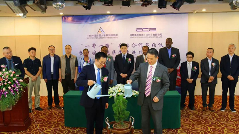 中外嘉宾代表见证了非洲研究院与佰博医生集团的签约,仪式结束后,双方签约代表给象征着基业常青的松树浇水。
