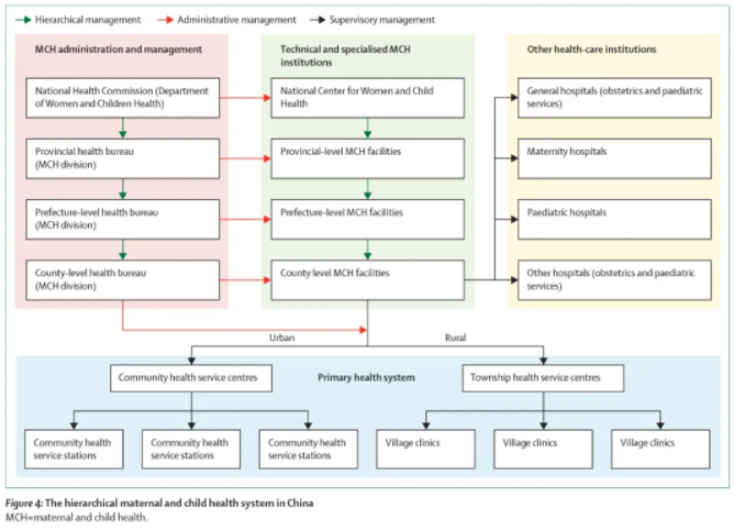 报告总结出以下几方面的决定性要素:一是保障妇女儿童健康权益的强烈政治意愿,中国政府颁布制定了一系列法律法规和规划方案(图1),“儿童优先、母亲安全”已成为一项全社会共识;二是构建了一套完善的分层分级妇幼保健服务体系,确保妇幼卫生政策及标准规范能够高效地从中央深入贯彻落实到基层(图2);三是建立了若干全国妇幼卫生信息系统,为制定妇幼卫生政策和评估国家重大卫生项目提供循证数据;四是持续深化医药卫生体制改革,不断提升基本医疗卫生服务的覆盖率和均等化;五是政府启动了国家基本公共卫生服务项目以及若干妇幼重大公共卫生服务项目,极大促进了妇幼保健服务的可及性及公平性;六是中国政府在脱贫攻坚上取得的成就,也从根本上保障了贫困地区及家庭的妇女儿童健康及发展权益。